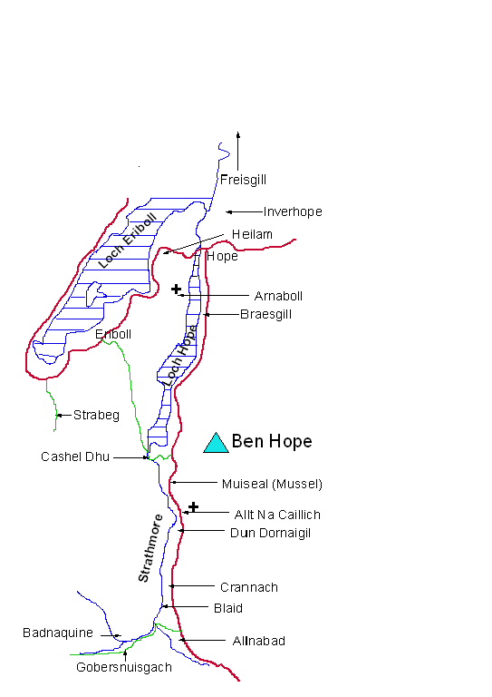 This page has been set up initially to provide a simple representation of the locations in Strathmore and close to Loch Hope that are referred to both in the personal family tree information held on this web site and the recordings I made for POSH of the burial grounds at Arnaboll and Allt na Caillich. I hope that it will be extended to cover further information on the locations as this comes to hand and will welcome any contributions. (Note: I gather that the POSH data is not currently available on-line - if you have any queries on those cemeteries please contact me by e-mail at donjgrant@aol.com.)
