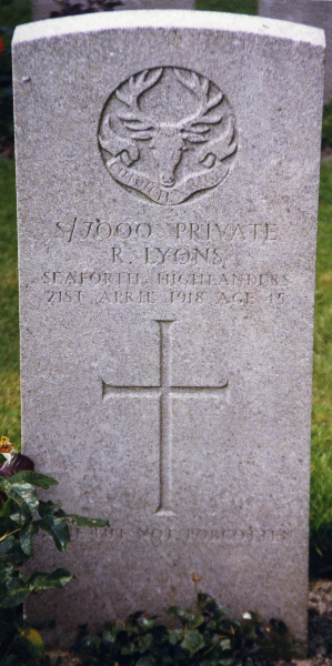 | Private Robert LYONS | S/7000 | 9th Bn, Seaforth Highlanders | April 21, 1918 | 45 | Lijssenthoek Military Cemetery | ss:Mary Jane McEwan; af:2 Bell St, Bridgeton, Glasgow | ||||