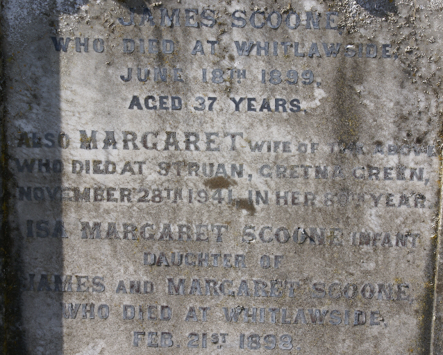 1. James Scoone who died at Whitlawside June 18th 1899 aged 37 years. Also Margaret wife of the above who died at Struan Gretna Green November 28th 1941 in her 80th year. Isa Margaret Scoone infant daughter of James and Margaret Scoone who died at Whitlawside Feb 21st 1899 Stone Text
