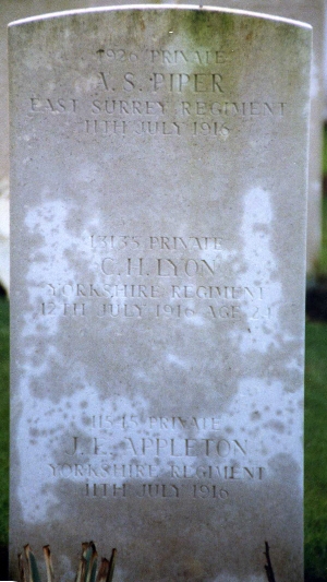 | Private Charles Haddon LYON | 13135 | 8th Btn Yorkshire Regiment | July 12, 1916 | 24 | Heilly Station Cemetery, Mericourt-L'Abbe, Somme | b:1891 Wilton, Yks; f:George Henry Lyon; m:Elizabeth Brudenell; ap:16 South Lackenby, Eston, Yorks | stone | ||