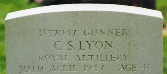 | Gunner Charles Sydney LYON | 1837047 | 461 Bty, 134 Heavy AA Regt, Royal Artillery | April 30, 1947 | 41 | Northampton (Dallington) Cemetery | b:1905 Northampton; f:Walter Lyon; m:Alice Amy Woodford, Northampton; w:Bessie Lyon, Northampton | |||