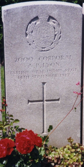 | Corporal Arthur Percival LYON | 2000 | 3rd/32nd Btn British West Indies Regt | September 14, 1917 | Dunkirk Town Cemetery, France | On CWGC as AP Lyon; b:Jamaica; d:Queen Alexandra Hospital, France; m:Eliza Ricketts; | stone | |||