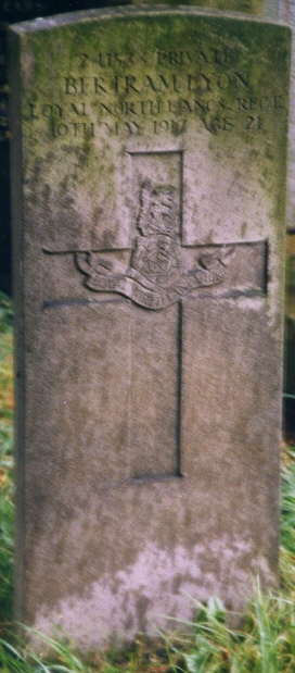 | Private Bertram LYON | 241533 | 1st/5th Btn The Loyal North Lancashire Regt | May 10, 1917 | 21 | Harwood (Christ Church) Churchyard, Lancashire | b:1895 Wigan; dow:Military Hospital, Eastbourne; f:Henry Lyon; m:Ellen Lyon; ap:3 Bottom-O'th'Moor, Harwood | stone | ||