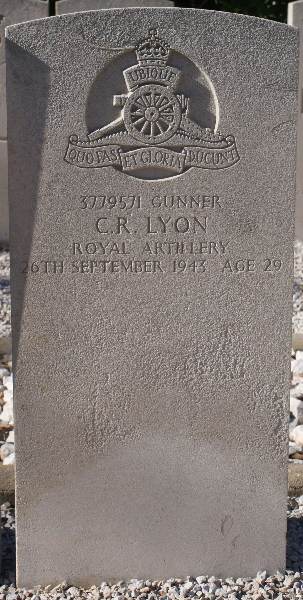 | Gunner Charles Rennard LYON | 3779571 | 466 Bty, 141 Light AA Regt, Royal Artillery | September 26, 1943 | 29 | Gibraltar (North Front) Cemetery | f:Henry Lyon of Liverpool; m:Catherine Lyon | stone | ||