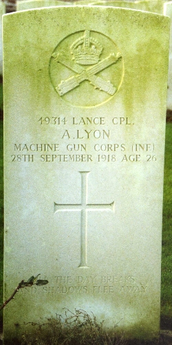 | Lance Corporal Alexander MacKinlay Bannantyne LYON | 49314 | 52nd Coy Machine Gun Corps (Inf) | September 28, 1918 | 26 | Moeuvres British Cemetery, France | b:25 Jul 1892 Rothesay; f:Malcolm Lyon; ap:Dobbies Cottage, Piershill, Edinburgh | |||