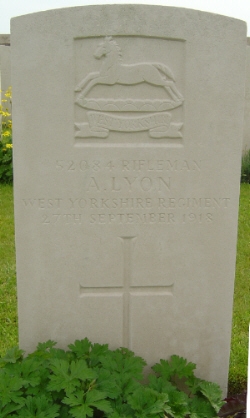 | Rifleman Albert LYON | 52084 | 8th Btn West Yorkshire Regt (Prince of Wales's Own) | September 27, 1918 | Orival Wood Cemetery, Flesquieres, France | f:Henry G Lyon | stone | |||