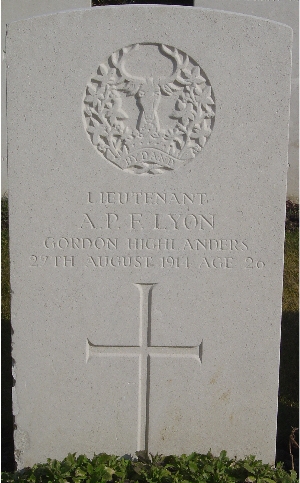 | Lieutenant Alexander Patrick Francis LYON | 1st Btn Gordon Highlanders | August 27, 1914 | 26 | Bertry Communal Cemetery, France | St Baldreds Church, North Berwick | Sandhurst 1906; b:5 Aug 1888 South Kensington; f:Walter Fitzgerald Knox Lyon; m:Isabella Romanes Towers-Clark; ap:Tantallon Lodge N Berwick; br: Cpn Charles J Lyon d 1914; br:Lt Walter S S Lyon d 1915 | stone | ||