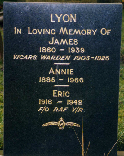 | Flying Officer Eric LYON | 104429 | Royal Air Force Volunteer Reserve | October 4, 1942 | 25 | Shevington (St Ann) Churchyard, Lancs | f:James Lyon; m:Annie Lyon of Shevington; w:Margaret Lilian Lyon of Gathurst | ||||