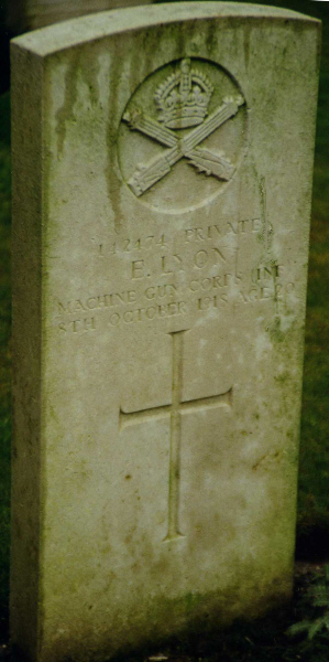 | Lance Corporal Edward Arthur LYON | 147858 | 47th Coy Machine Gun Corps | November 1, 1918 | 26 | Terlincthun British Cemetery, Wimille, Pas de Calais | b 1888 Mile End; f: Arthur Matthew T Lyon; m:Mary Frances Willis; af:32 Cleveland Park Avenue, Walthamstow | ||||