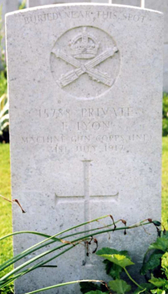 | Private Fred LYON | 15788 | 25th Coy Machine Gun Corps (Inf) | July 31, 1917 | 30 | Divisional Collecting Post Cemetery Extension, Boezinge, Belgium | North Collingham - All Saints Church | f:John Lyon; af:North Collingham, Newark Notts | |||