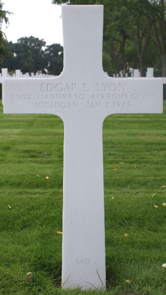 | Staff Sergeant Edgar E LYON | 16033854 | 714th Bomber Squadron, 448th Bomber Group, US Army Air Forces | January 2, 1945 | N/K | Cambridge American Cemetery | e:Michigan | ||||