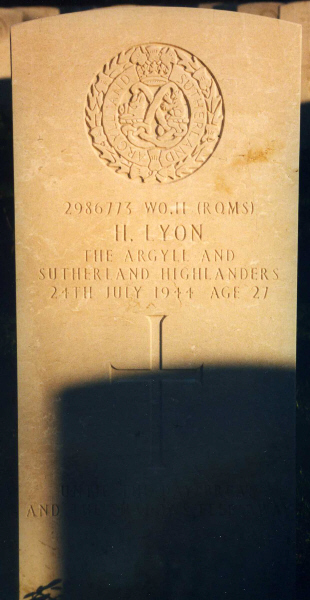 | Warrant Officer II Harry LYON | 2986773 | 7th Bn, Argyll & Sutherland Highlanders | July 24, 1944 | 27 | La Delivrande War Cemetery, Douvres | RQMS ; b:27 Feb 1917 Polmont; f:Hugh Lyon; m:Catherine Clark Ramsay; w:Margaret Lyon of Redding, Falkirk | ||||