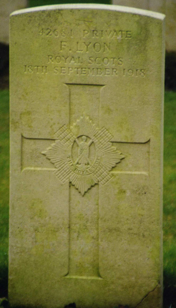 | Private Frank LYON | 42681 | 2nd Btn Royal Scots | September 18, 1918 | 21 | Morchies Australian Cemetery, Pas de Calais | b:28 Mar 1897; f:Thomas Lyon; m:Margaret Latham | ||||