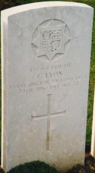 | Private George LYON | 492762 | 13th Kensington Btn, London Regt | June 27, 1917 | 32 | Duisans British Cemetery, Etrun, Pas de Calais | b:1885 Dalston; dow:41st CCS, France; f:George Lyon; m:Eliza Smith; w:Annie J Evans = 1915 Hackney; af:52 Narford Road, Clapton, London | ||||