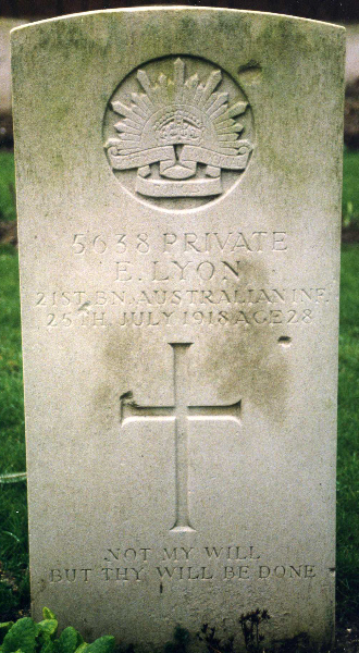 | Private Ernest LYON | 5638 | 21st Btn Australian Infantry, A.I.F. | July 25, 1918 | 28 | Longueau British Cemetery, Somme | Perth WA War Memorial | f:William Lyon; m:Edith Lyon; af:150 Gladstone Avenue, Northcote, Victoria, Australia. n:England. | memorial | ||