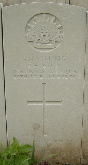 | Private Francis Andrew LYON | 7570 | 11th Btn Australian Infantry A.I.F. | June 29, 1918 | 33 | Longuenesse (St Omer) Souvenir Cemetery, Pas de Calais | f:Andrew Wallace Lyon; m:Marion Lyon; w:Freda L C Lyon; af:Strathaven Mcpherson Street, Nhill, Victoria, Australia | ||||