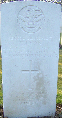 | 2nd Lieutenant Eric LYON | 1st/3rd Btn Duke of Wellington's (West Riding Regt) attd 15th Btn Lancashire Fusiliers | November 4, 1918 | 22 | Ors British Cemetery, France | b:1896 Scarborough; f:Ralph Robert Lyon; m:Sarah Jane Wyrill; af:Woodville, Carr Lane, Acomb, York | |||||