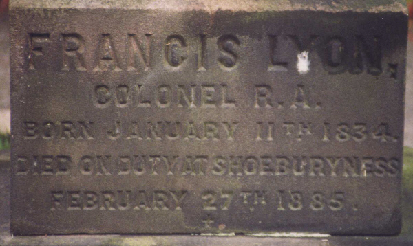 | Colonel Francis LYON | Royal Artillery | February 27, 1885 | 51 | Stretton (St Matthew)Churchyard, Cheshire | Died on duty at Shoeburyness; b 11.01.1834; son Arthur died 1920. | stone(2) | ||||