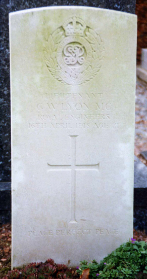 | Lieutenant George William LYON MC | 511th London Field Coy, Royal Engineers | April 16, 1918 | 21 | Boves West Communal Cemetery, Somme | b:1897 Gillingham; f:Mark Henry Lyon; m:Eliza Ann Lyon; af:43 Marlborough Road, Gillingham, Kent | |||||