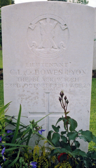 | Lieutenant Charles Lindsay Claude BOWES-LYON | 3rd attd 1st Bn Black Watch (Royal Highlanders) | October 24, 1914 | 29 | New Irish Farm Cemetery, Ieper | b:15 Sep 1885; kia:Pilken; f:the Hon Francis Bowes-Lyon; m:Lady Anne Catherine Sybil Lindsay; af:Ridley Hall, Bardon Mill, Northumberland | |||||