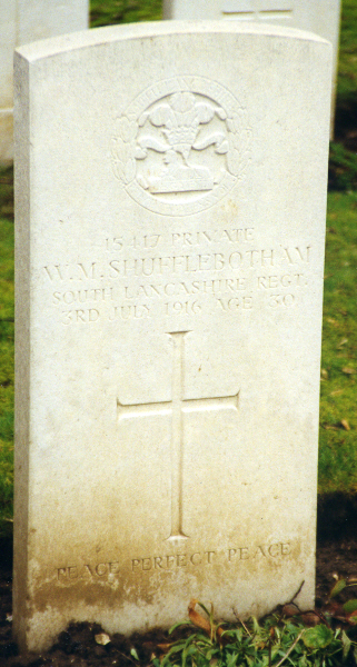 | Private William Mellor SHUFFLEBOTHAM | 15417 | 8th Btn, South Lancashire Regt. (formerly no 17417 Cheshire Regt) | July 3, 1916 | 30 | Connaught Cemetery, Thiepval, Somme | b:1886 Witton, Cheshire; f:William Mellor Shufflebotham; m:Sarah Ann Davenport; ap:147 Middlewich Rd, Northwich; e:Northwich. |