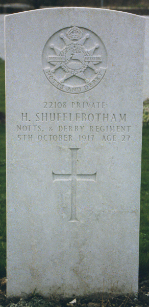 | Private Harold SHUFFLEBOTHAM | 22108 | 1st/8th Btn, Sherwood Foresters (Notts and Derby Regt) | October 8, 1917 | 27 | Philosophe British Cemetery, Mazingarbe, Pas de Calais | b:1890 Burslem; f:John Shufflebotham; m:Mary Phillips; ap:79 Russell Street, Dresden, Longton, Stoke on Trent; e:Longton | ||||