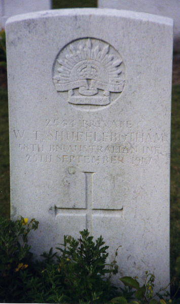 | Private W T SHUFFLEBOTHAM | 2544 | 58th Btn, Australian Infantry, A.I.F. | September 25, 1917 | N/K | Hooge Crater Cemetery, Ieper, Belgium | |||||