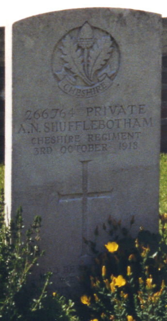 | Private Andrew Nathaniel SHUFFLEBOTHAM | 266764 | 1st/6th Btn, Cheshire Regt | October 3, 1918 | 29 | La Kreule Military Cemetery, Hazebrouck, France | b:1889 Brixton; f:Andrew Shufflebotham; m:Elizabeth Shufflebotham; ap:15 Whitefield, Heaton Norris, Stockport; w:Mary Clarke = 1913 Stockport; af:102 Chapel Street, Edgeley, Stockport; e:Stockport. | ||||