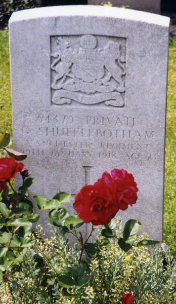 | Private Gilbert SHUFFLEBOTHAM | 54379 | 2nd/9th Btn, Manchester Regt | January 29, 1918 | 23 | Lijssenthoek Military Cemetery, Poperinge, Belgium | b:1894 Longton; f:John Thomas Shufflebotham; m:Emmylyn Emma Edgerton; ap:4 Ludwall Road Longton; w:Ada Cotton; af:238 Uttoxeter Road, Longton, Staffs; e:Longton. | ||||