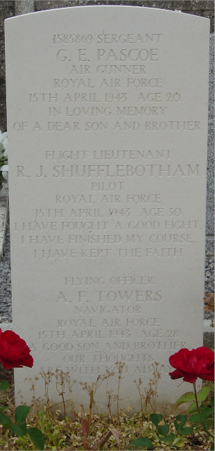 | Flight Lieutenant Reginald James SHUFFLEBOTHAM | 66495 | 100 Squadron, Royal Air Force Volunteer Reserve | April 15, 1943 | 30 | Bohain Communal Cemetery, Aisne, France | f:William Hassal Shufflebotham; m:Lilian James; w:Winifred Mary Shufflebotham of Blythe Bridge, Staffs; Schoolmaster | ||||